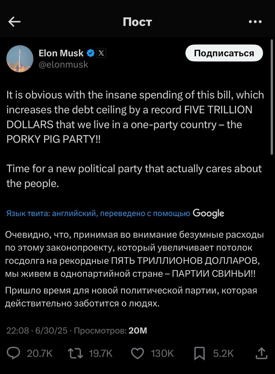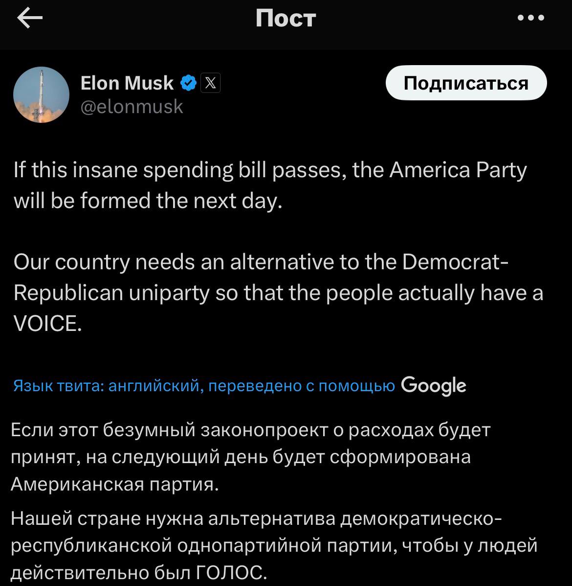 В соцсети X Илон Маск, говоря о законопроекте о сокращении расходов, назвал его долговым рабством, увеличивающим потолок госдолга страны на $5 триллионов. Соединенные Штаты он окрестил однопартийной страной под управлением «партии свиньи» и заявил, что в случае принятия документа будет создана «Американская партия» как альтернатива существующим.