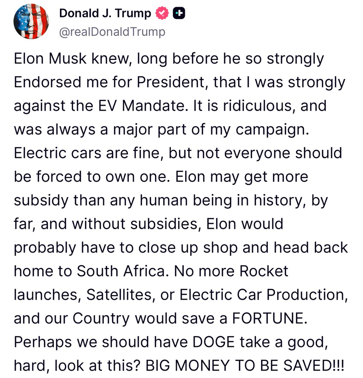 «Илон Маск задолго до того, как поддержал меня на выборах президента, знал, что я категорически против обязательного использования электромобилей. Это смешно, и это всегда было главной частью моей кампании. Электромобили — это хорошо, но не нужно заставлять всех владеть ими. Илон, возможно, получает больше субсидий, чем любой человек в истории, и без субсидий Илону, вероятно, пришлось бы закрыть магазин и вернуться домой в Южную Африку. Больше никаких запусков ракет, спутников или производства электромобилей, а наша страна сэкономит целое состояние. Может быть, нам стоит попросить DOGE хорошенько, внимательно посмотреть на это?» — написал он.