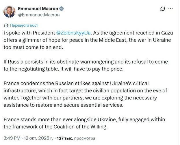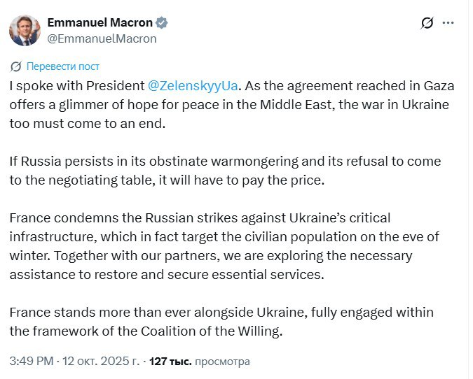 «РФ придется заплатить, если она продолжит упорствовать и не захочет садиться за стол переговоров», — написал президент Франции на своей странице в X после телефонного разговора с Владимиром Зеленским.
