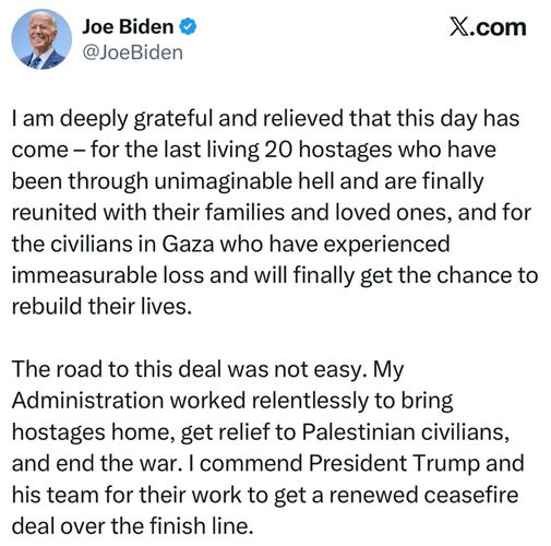 «Я глубоко благодарен и испытываю облегчение за то, что этот день настал — за последних оставшихся в живых 20 заложников, которые прошли через невообразимый ад и наконец-то воссоединились со своими семьями и любимыми, а также за гражданских лиц в Газе, которые пережили неизмеримые потери и, наконец, получат шанс восстановить свою жизнь», — отметил Джо Байден.