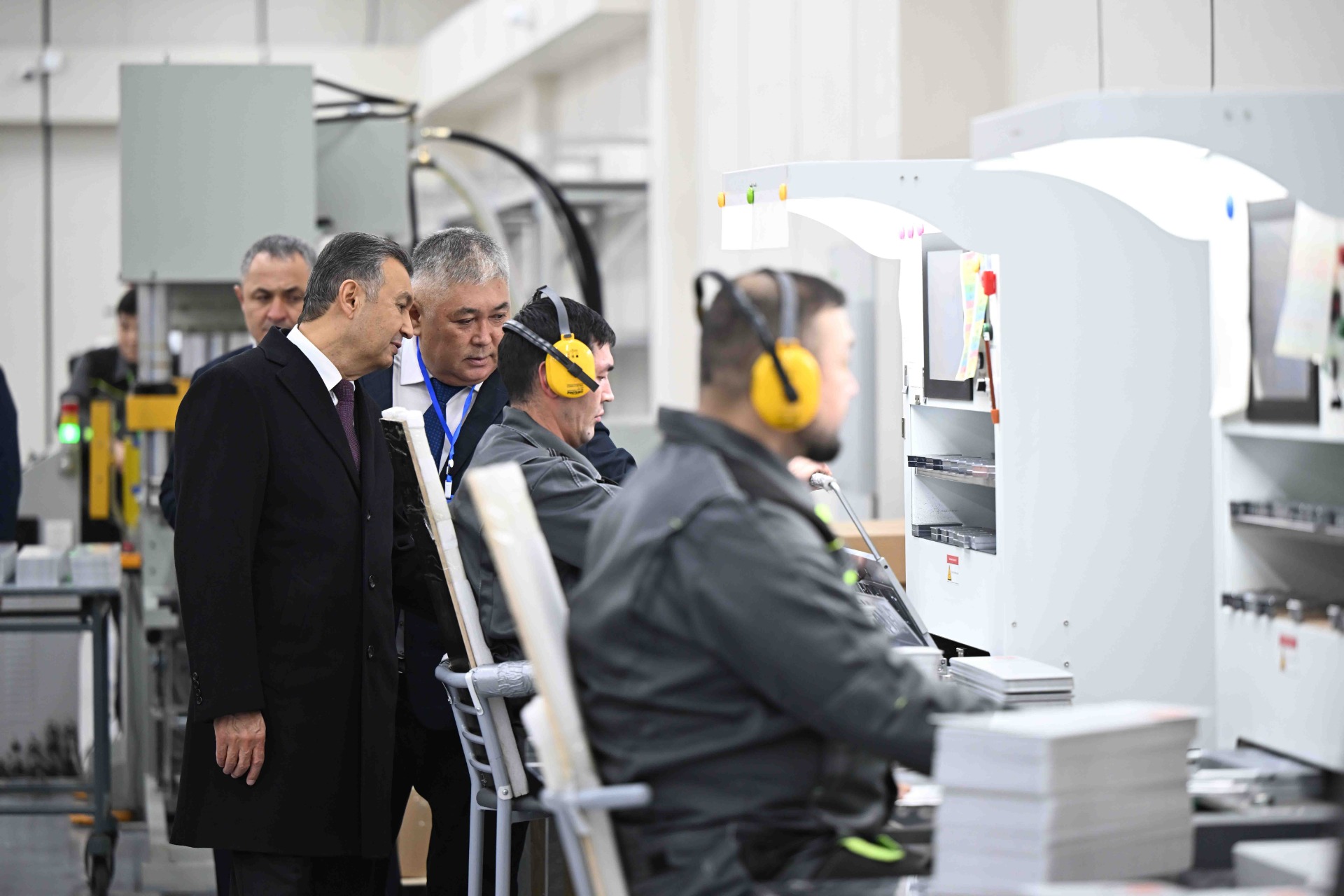 В компании «Учкун» главы правительств посетили переплетный и офсетный цеха, где изготавливается печатная продукция. Делегации продемонстрировали процесс производства акцизных марок, документов государственного значения, специальных бланков и государственных регистрационных номерных знаков. Также представили оборудование для маркировки и контроля качества топлива.