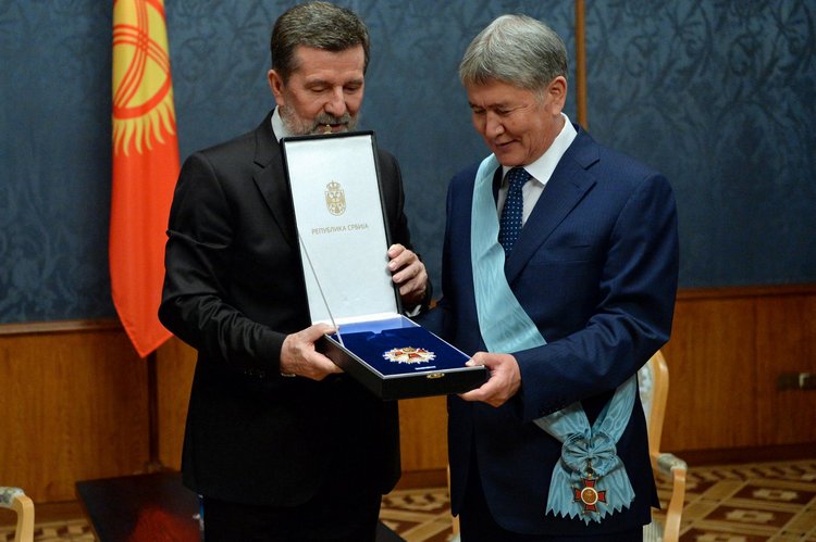 Орден главе Кыргызстана вручил Чрезвычайный и Полномочный Посол Республики Сербии в Кыргызстане с резиденцией в Москве Славенко Терзич. От имени руководства Сербии он выразил президенту Алмазбеку Атамбаеву признательность за вклад в развитие дружественных отношений между странами.