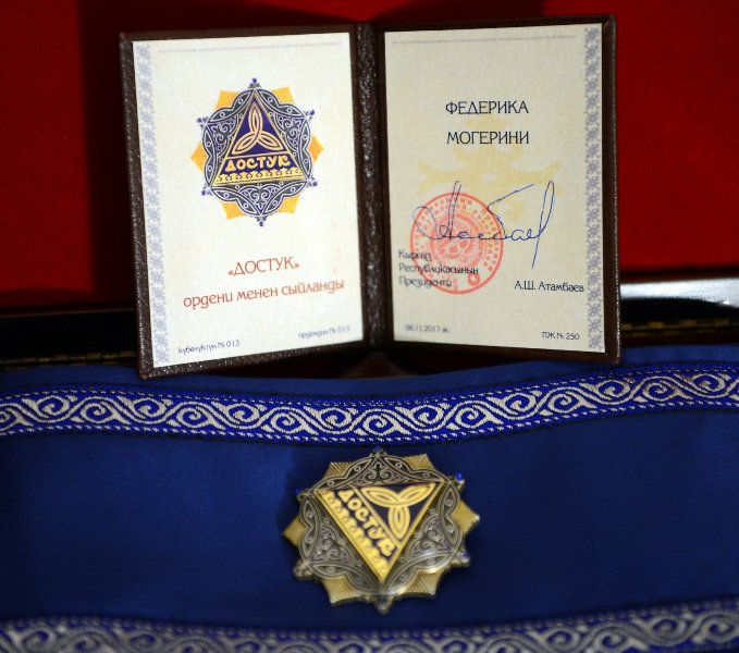 По данным пресс-службы главы государства, в начале встречи Атамбаев наградил Федерику Могерини орденом «Достук» за значительный вклад в развитие сотрудничества между КР и ЕС.