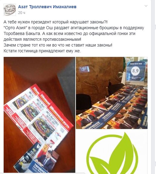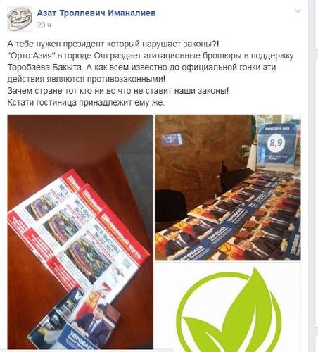 «Орто Азия» в городе Ош раздает агитационные брошюры в поддержку Бакыта Торобаева. До официальной гонки эти действия являются противозаконными! Зачем стране тот, кто ни во что не ставит наши законы? Кстати, гостиница принадлежит ему же», — написал пользователь.