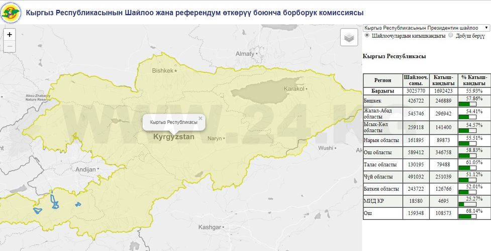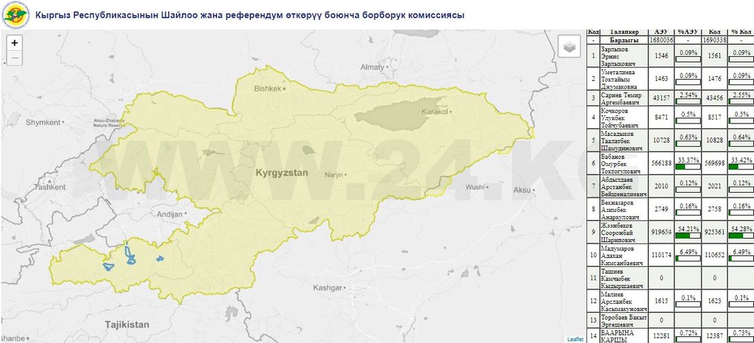По итогам ручного подсчета данных со всех участковых избирательных комиссий у Сооронбая Жээнбекова 925 тысяч 361 голос избирателей. Это 54,74 процента от числа проголосовавших. На втором месте Омурбек Бабанов — 569 тысяч 697 голосов, или 33,7 процента.