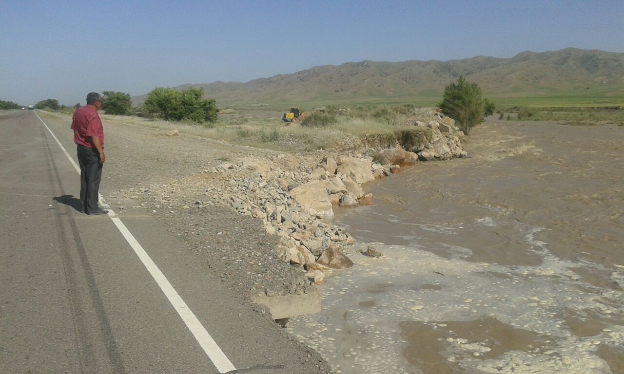 А на днях из-за жары поднялся уровень воды в реке Чу и поток приблизился к краю стратегической трассы Бишкек – Нарын – Торугарт на опасное расстояние, грозя смыть ее.