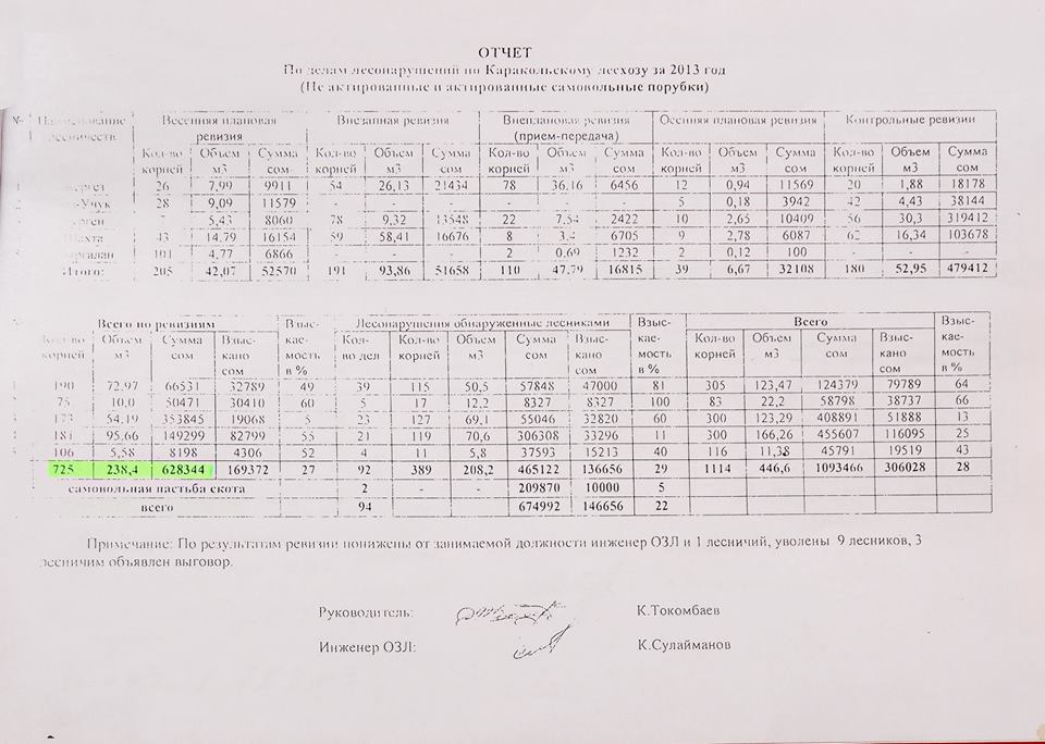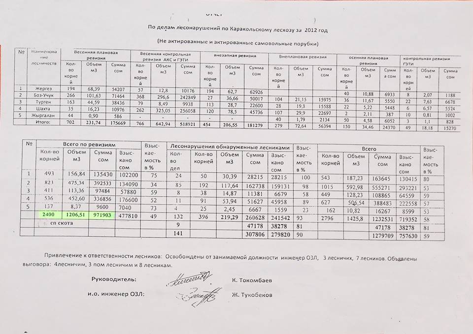 Согласно протокольному поручению от 3 сентября 2013 года, сотрудники Департамента лесохотустройства рассчитали, что эти убытки и потери составят 21 миллион 354 тысячи сомов. Расчеты отправили главе Госагентства, на тот момент Сабиру Атаджанову. Однако отчет в ОсОО «Казахмыс» он не представил. Да и компании с их неоднократными гарантийными письмами разрешение на вырубку не дали. А в начале декабря главный лесник страны дает поручение начальнику управления Госэкологической экспертизы и природопользования Кенешбеку Жумабекову выдать документы в однодневный срок на основании гарантийного письма ОсОО «Казахмыс Голд Кыргызстан». Отметим, что такими полномочиями ведомство не обладало.