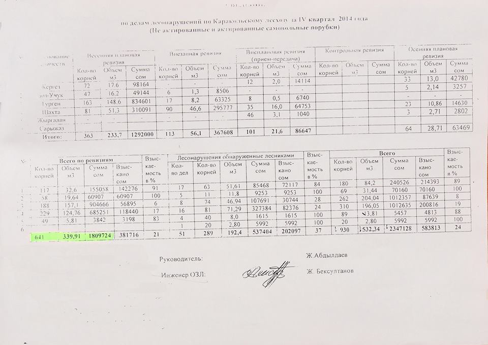 Далее по поручению Госэкологической экспертизы Джалал-Абадское территориальное управление производит расчет ущерба лесохозяйственного производства согласно таксам на древесину лесных пород, отпускаемую на корню как малоценные насаждения. И ранее начисленный казахам 21 миллион волшебным образом превращается в 4 миллиона 610 тысяч сомов.