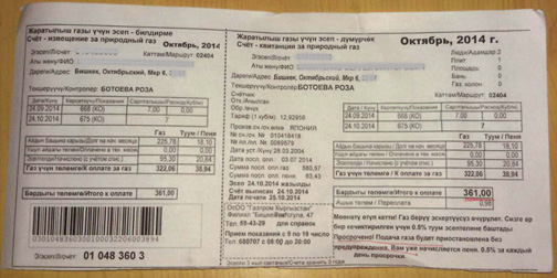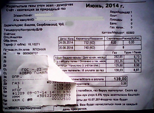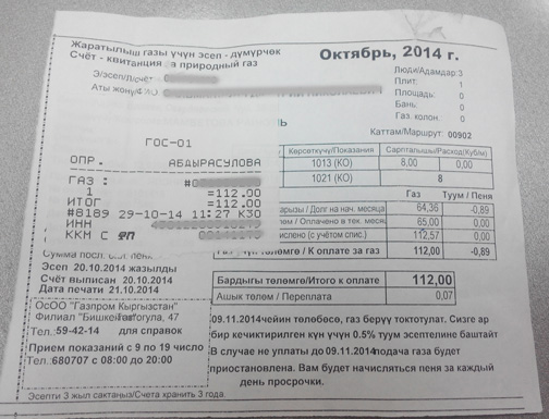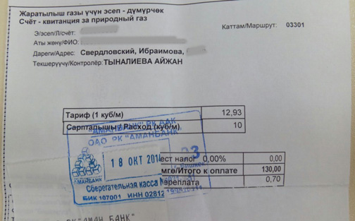 Отдельного внимания, конечно, заслуживают оплата счетов и утвержденный тариф. В настоящее время для бытовых потребителей он составляет 12,93 сома за кубометр топлива. Закидываем на карту 10 кубов. К оплате должно быть выставлено 129,3 сома. Вместо этого кассир округляет счет в свою пользу - до 130 сомов. Бишкекгазу ушло 70 тыйынов, несмотря на то, что расчет должен производиться по тому тарифу, который утвержден Государственным департаментом по регулированию топливно-энергетического комплекса.