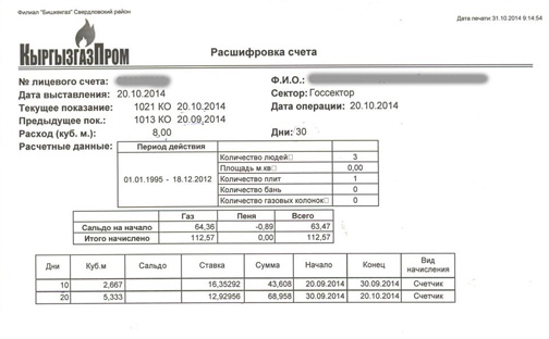 К примеру, наш абонент, проживающий в «Востоке-5», за 10 дней сентября использовал 2,667 кубометра газа по тарифу 16,35 сома, а за 20 дней октября – 5,3 куба по 12,93 сома. В итоге и получаются 112,5 сома, указанные в квитанции. «Если мы будем писать полный расклад, то счет выйдет на целую страницу. Поэтому в базе все расписано, и по обращению граждан мы разъясняем, как производится начисление», - рассказали в Бишкекгазе.