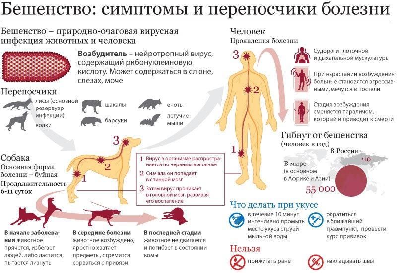 Медики напоминают, что бешенством можно заразиться от больных собак, кошек, лисиц, волков и других животных. «Заражение происходит при укусе. Вирус передается и со слюной. Зачастую зараженные поздно обращаются за медицинской помощью и нарушают режим во время прививок. Большинство заразившихся после контакта с больным животным не обращались в медицинские учреждения», - говорится в сообщении.